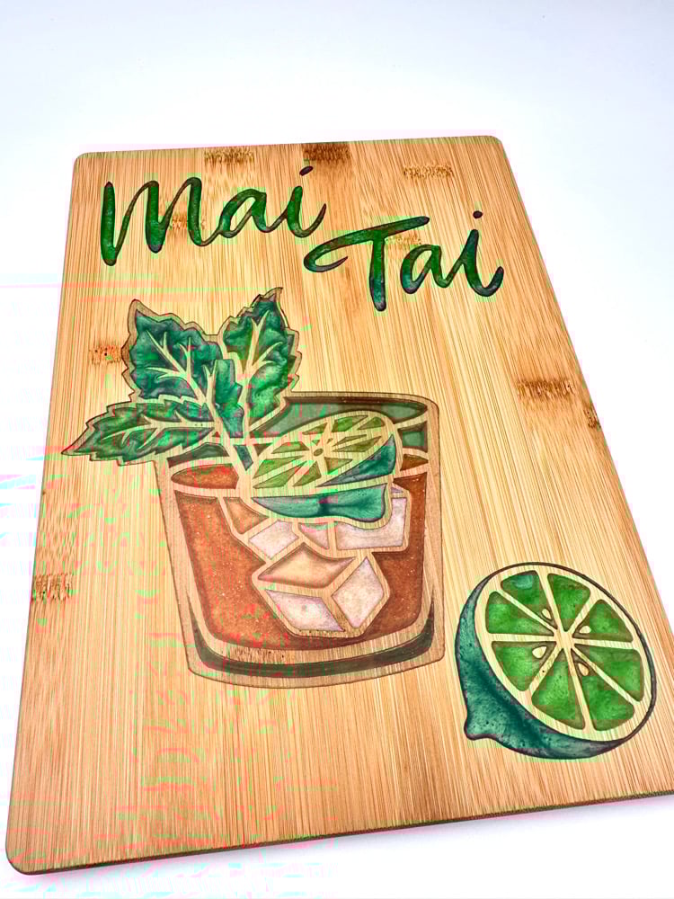 Bring island vibes to your happy hour with this handcrafted wooden cocktail board, featuring a vibrant epoxy resin inlay of the classic Mai Tai. The bamboo wood grain pairs perfectly with the colorful, artful drink design, making it as much a piece of art as it is a functional bar essential. Perfect for slicing citrus, preparing garnishes, or serving small bites, this food-safe board is durable enough for everyday use and stylish enough to display when the party’s over.